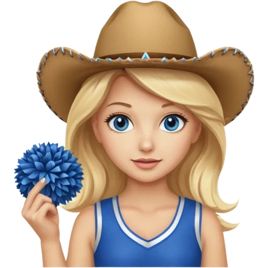 Dancer with light skin wearing royal Blue miniskirt and royal blue long tank top with blond wavy long hair. Holding silver pom poms. emoji