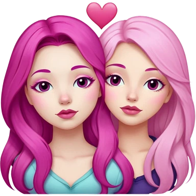 gorgeous pale girl with long magenta pink hair latina makeup next to a gorgeous blonde girl with a light pink heart above them in between eyes closed making duck lips faces emoji