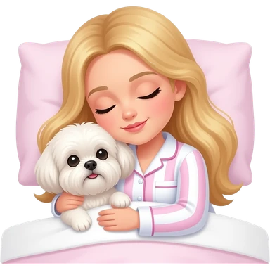 A blonde girl with long hair, wearing white pajamas with pink stripes similar to those from Victoria's Secret, is sleeping in bed hugging her Shih Tzu dog white emoji