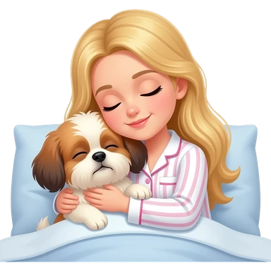 A blonde girl with long hair, wearing white pajamas with pink stripes similar to those from Victoria's Secret, is sleeping in bed hugging her Shih Tzu dog. emoji
