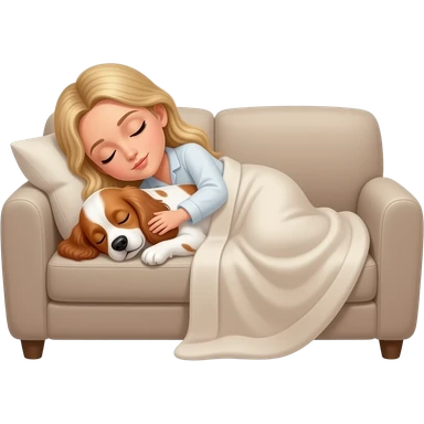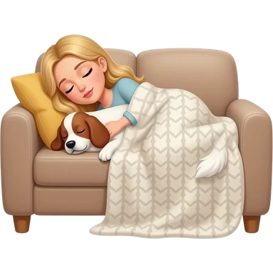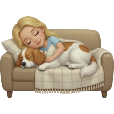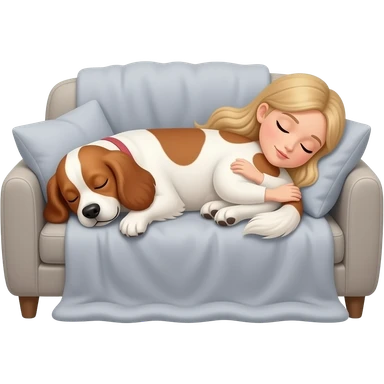 White woman with Long blond hair sleeping on sofa covered with blanket with a sleeping White/red cockerspaniel emoji
