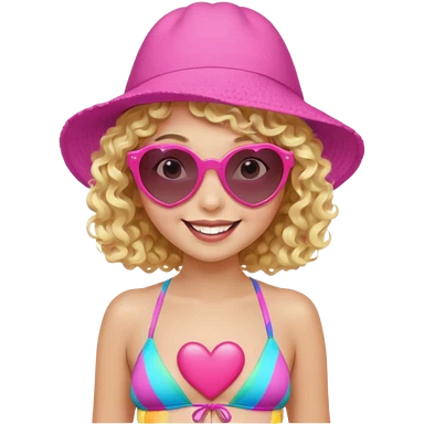 young girl, short curly blonde hair, white skin, pink floppy hat, heart sunglasses, colorful bikini, big bright smile emoji
