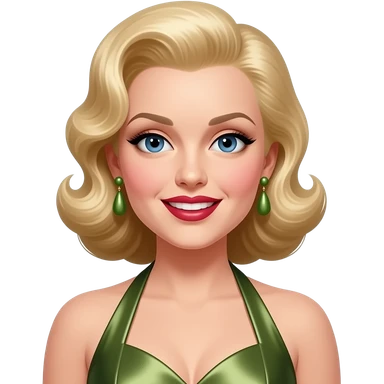 Patty Andrews from The Andrews Sisters with dark blue eyes, long blonde 40s victory roll hair, olive metallic halter dress, olive earrings emoji