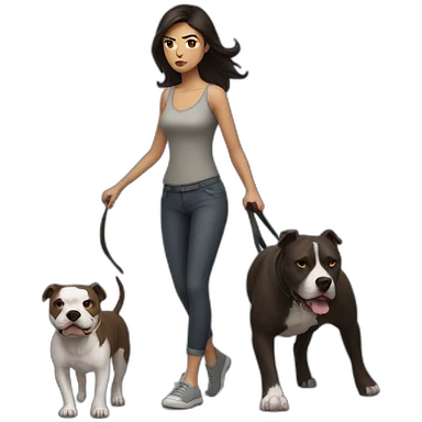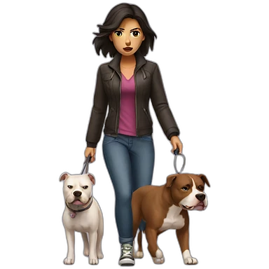 a woman with dark hair is angry and walks with a pitbull emoji
