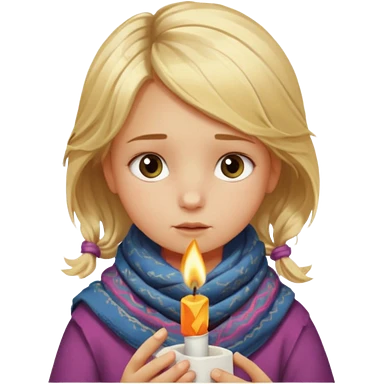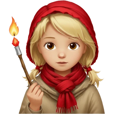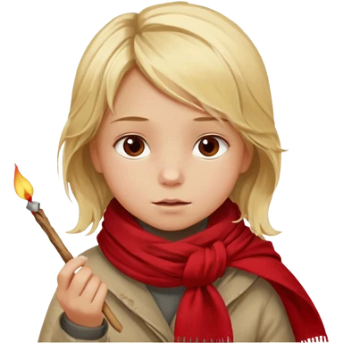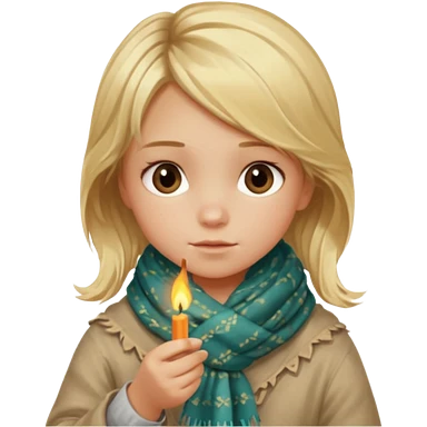 A little girl with messy blonde hair, wrapped in a thin scarf, lighting a match with shaky hands as warm light reflects in her eyes. emoji