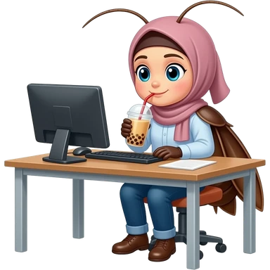 Hijab secretary cockroach working at her desk and drinking bubbletea emoji
