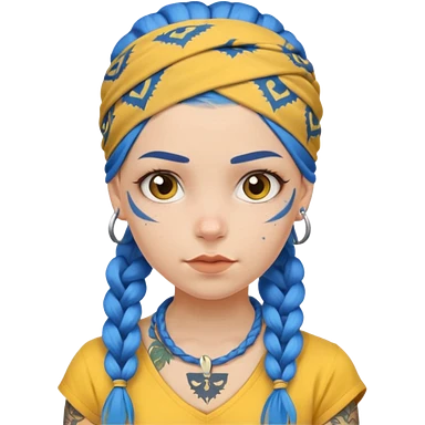blue braided hair with yellow head bandana and lots of face tattoo girl emoji