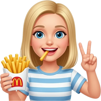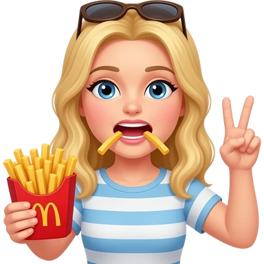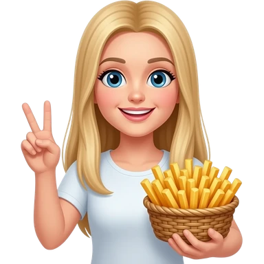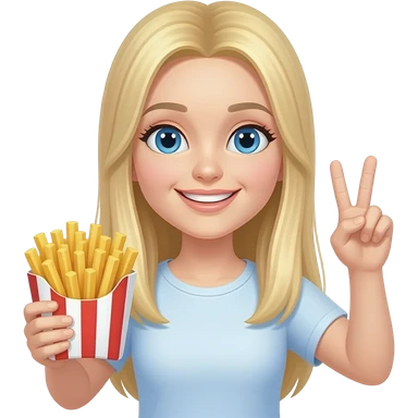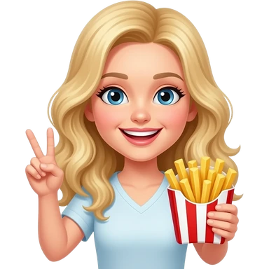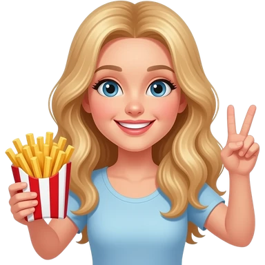 Blonde lady holding french fries throwing up peace sign sticking out tounge emoji | AI Emoji Generator