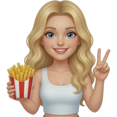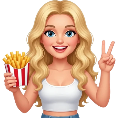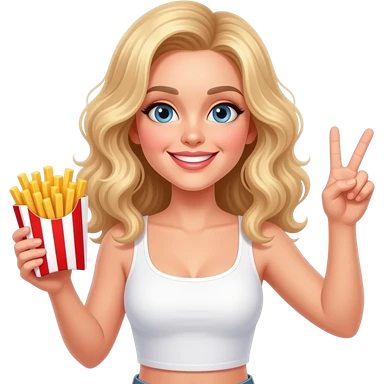 Blonde lady crimped wavy hair middle part mid back long holding french fries in a stripped red and white holder throwing up peace with innocent smile in a white tube top emoji
