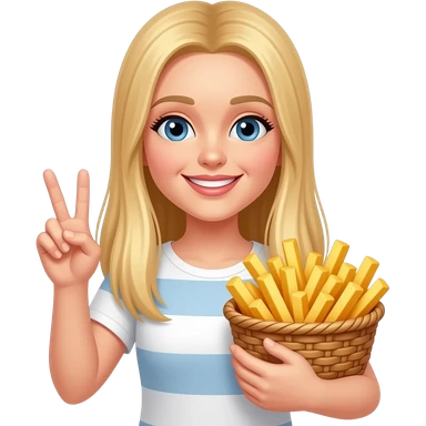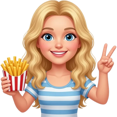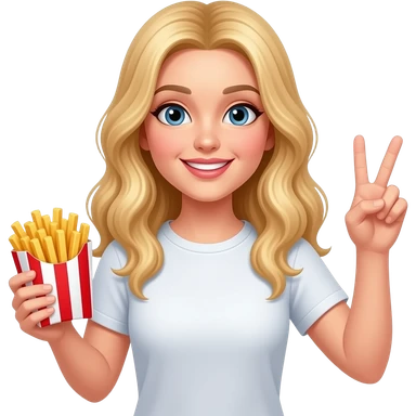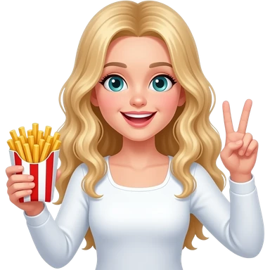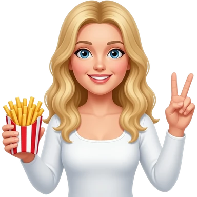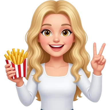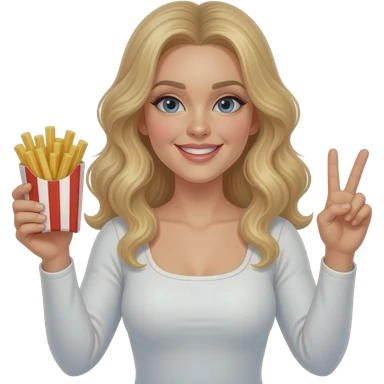 Blonde lady crimped straight hair middle part long holding french fries in a stripped red and white holder throwing up peace with innocent smile in a long sleeve white top with a square neck emoji