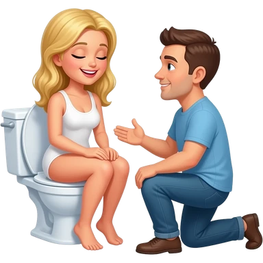 NUDE blond woman sitting on toile. Smiling. Eyes closed. Man kneeling in front of her emoji