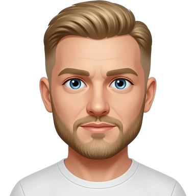 40-year-old man, professionally dressed without a tie, blonde with very short wavy hair, with an almost invisible beard and blue eyes. emoji