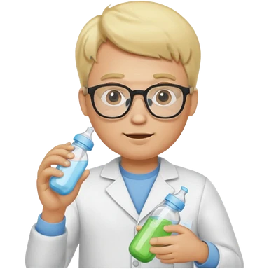 blonde man with white coat and glasses holding skincare products emoji