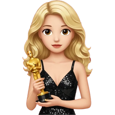 blonde model, brown eyes, long wavy hair, oscars red carpet, black sequin, holding oscar emoji