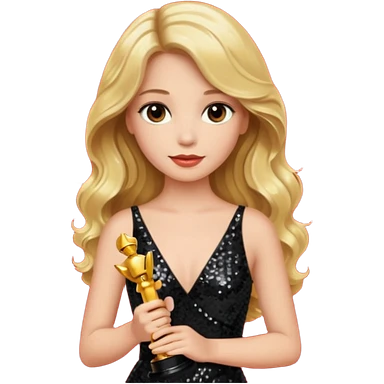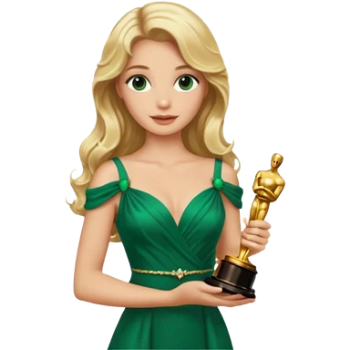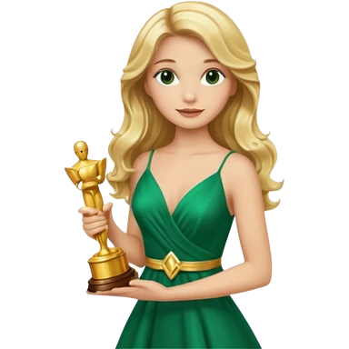 blonde model, brown eyes, long wavy hair, oscars red carpet, emerald green, holding oscar emoji | AI Emoji Generator