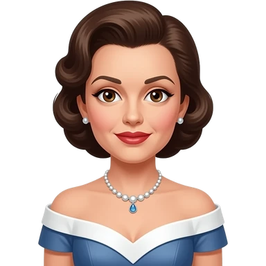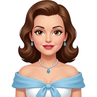 Judy Garland with brown eyes, long brown hair, white and blue oscars off shoulder dress, necklace and earrings emoji