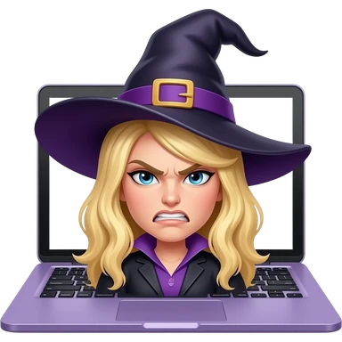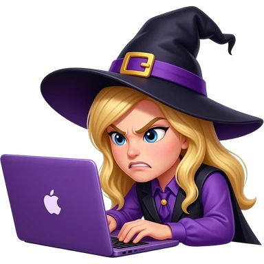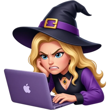 blonde witch, resting head on purple apple macbook keyboard, looking angry,purple and black outfit, coding emoji