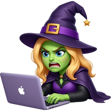 blonde witch with head on purple apple macbook keyboard, purple and black outfit emoji | AI Emoji Generator