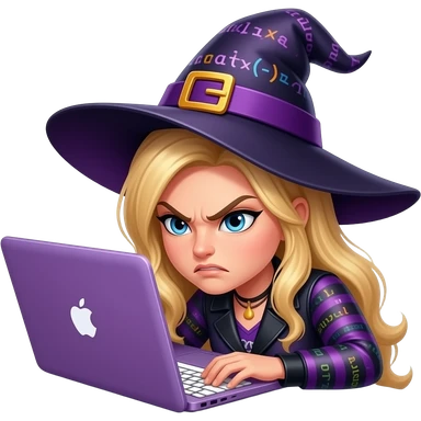 blonde witch, resting head on purple apple macbook keyboard, looking angry,purple and black outfit, with code surrounding her emoji