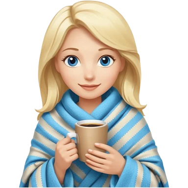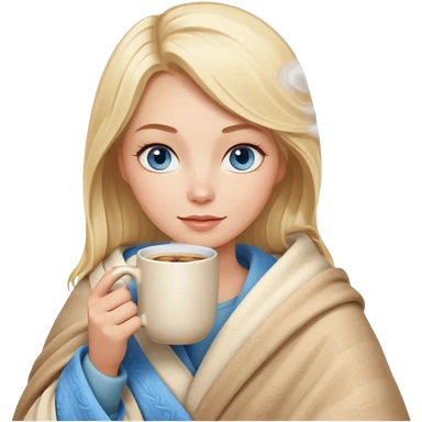 Cute dark Blonde girl with blue eyes wrapped in blanket drinking coffee emoji