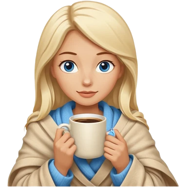 Blonde woman with blue eyes wrapped in blanket drinking coffee emoji