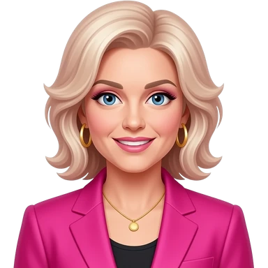 Jerrica/Jem from Jem and the Holograms with blue eyes, long blonde and pink 80s rocker hair, pink eyeshadow, pink lipstick, hot pink metallic high neck dress, red earrings emoji