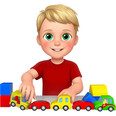 Use the same 3 year old blonde boy with green-blueish eyes as before happy playing with toys emoji