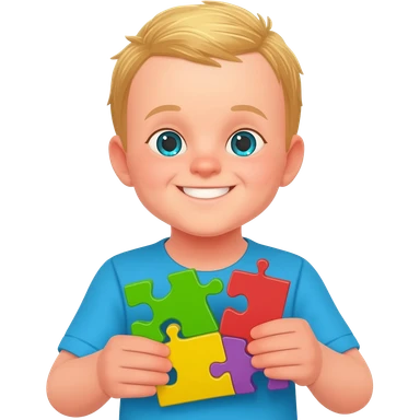 Use the same 3 year old blonde boy with green-blueish eyes as before happy playing with toys making puzzles emoji