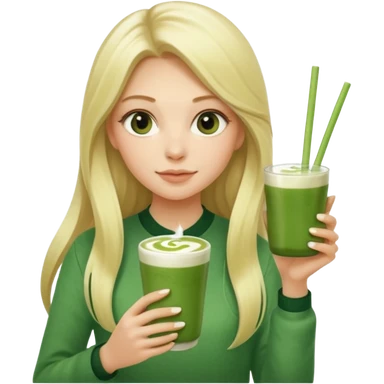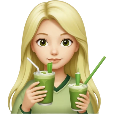 blonde luxury long hair girl with 1 matcha latte and 2 straws emoji