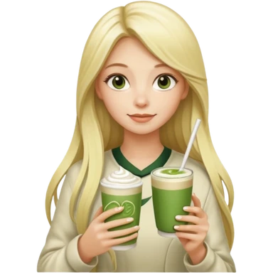 blonde luxury long hair girl with 1 cup of matcha latte and 2 straws emoji