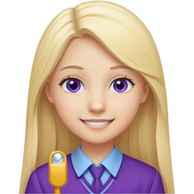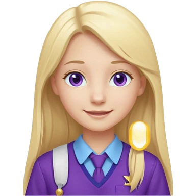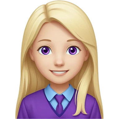 A pale girl with light blue eyes and long and blonde straight hair , smiling wearing a purple school uniform emoji