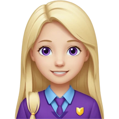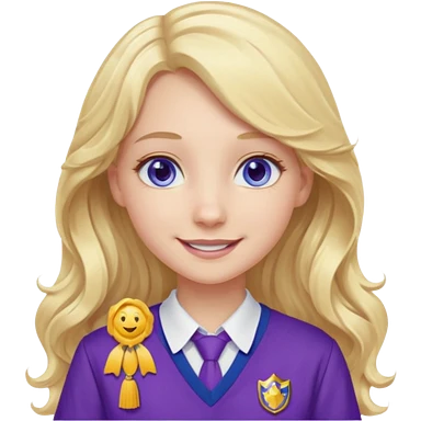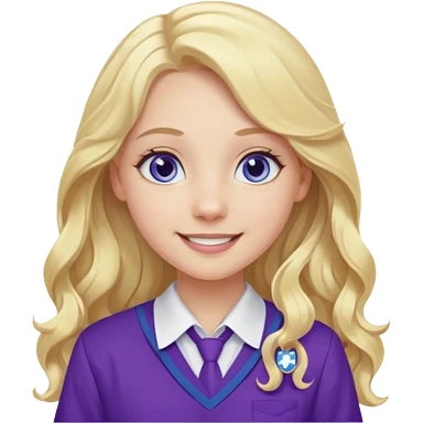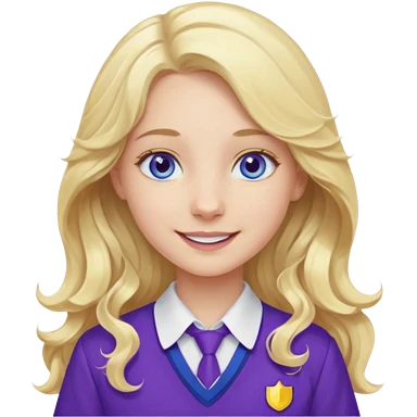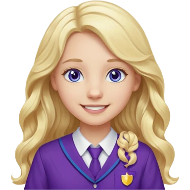 A pale girl with blue eyes and long and blonde , wavy hair , smiling wearing a purple school uniform emoji
