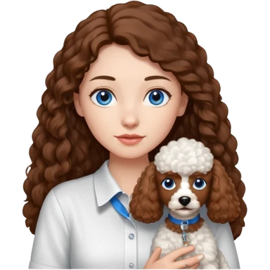 Kobieta w białej koszuli, z długimi brązowymi włosami i niebieskimi oczami trzyma na rękach brązowego pudla. emoji