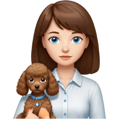 Kobieta w białej koszuli, z długimi brązowymi włosami z grzywką i niebieskimi oczami trzyma na rękach jednokolorowego, brązowego pudla. emoji