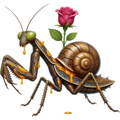 Saprawl A slow forest mantis crawler with sticky amber sap running through cracks in its bark-like body. it's made of bark but has one flowers blooming on its back, it has rose spikes and runs fast with all its limbs. It's full of leave markings, and looks like a mantis with a snail armor emoji