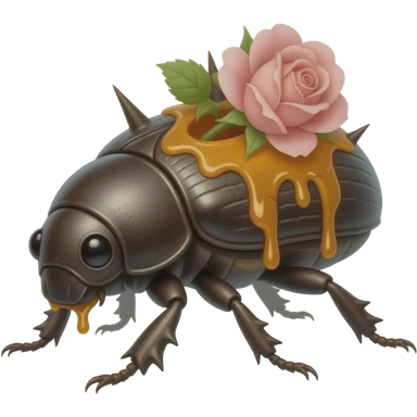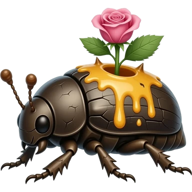 Saprawl A slow forest beetle crawler with sticky amber sap running through cracks in its bark-like body. it's made of bark but has one flowers blooming on its back, it has rose spikes and runs fast with all its limbs emoji