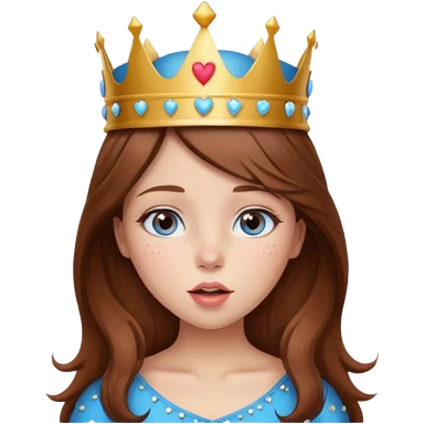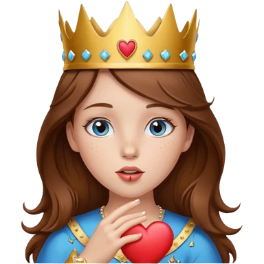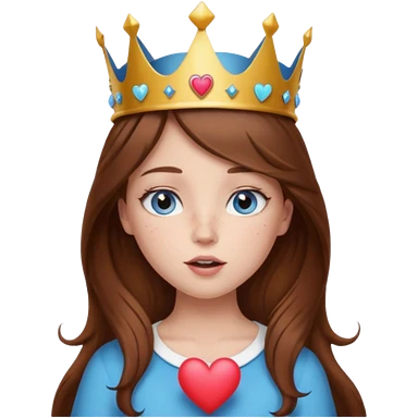 a girl with brown hair, blue eyes and freckles, who wears a crown and is blowing a heart kiss emoji