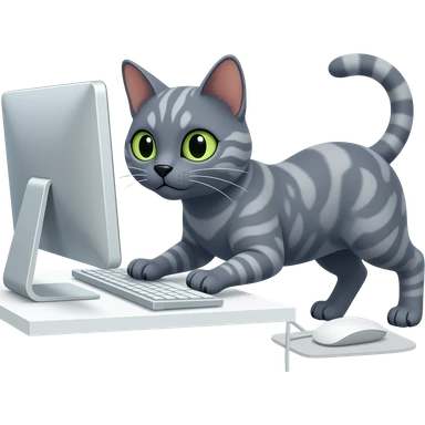 ((blue gray tortoiseshell pattern cat shorthair)) ((black paws nose)) ((green eyes)) working on computer emoji
