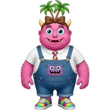 a pink monster who has a brown bow on her forehead. she also has palm trees sticking out of her head. she is wearing blue jean overalls and has a white shirt with a monster on it under the overalls. she is very big, very wide and tall. she is wearing tyedye shoes. emoji