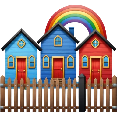 Blue house with a black fence & red house with a rainbow coloured fence. emoji