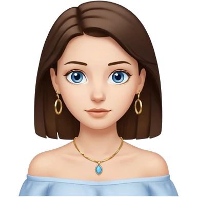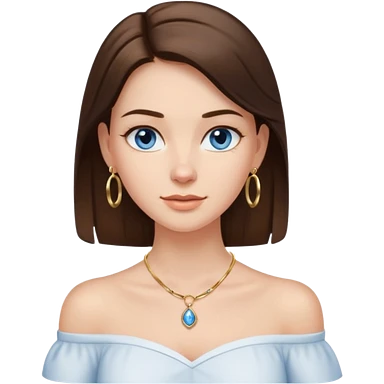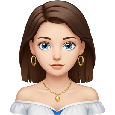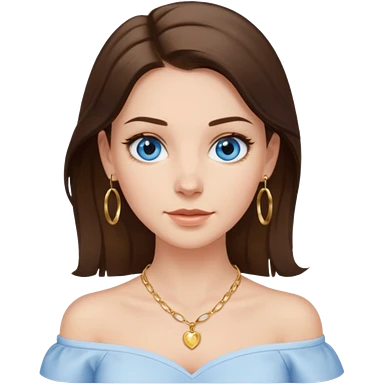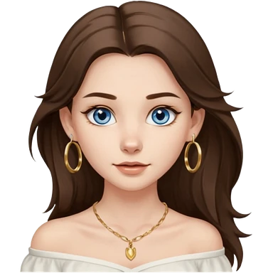 A pretty white girl with brunette hair blue eyes thin gold hoop earrings and a matching gold necklace in a white shirt that cuts off the shoulders emoji