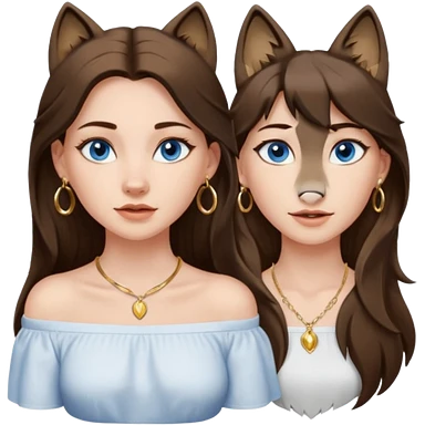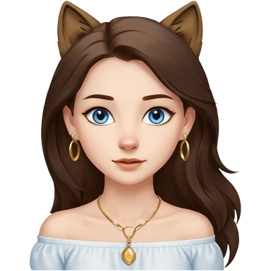 A pretty white girl with brunette hair blue eyes thin gold hoop earrings and a matching gold necklace in a white shirt that cuts off the shoulders her hair is long and she has a wolf cut emoji