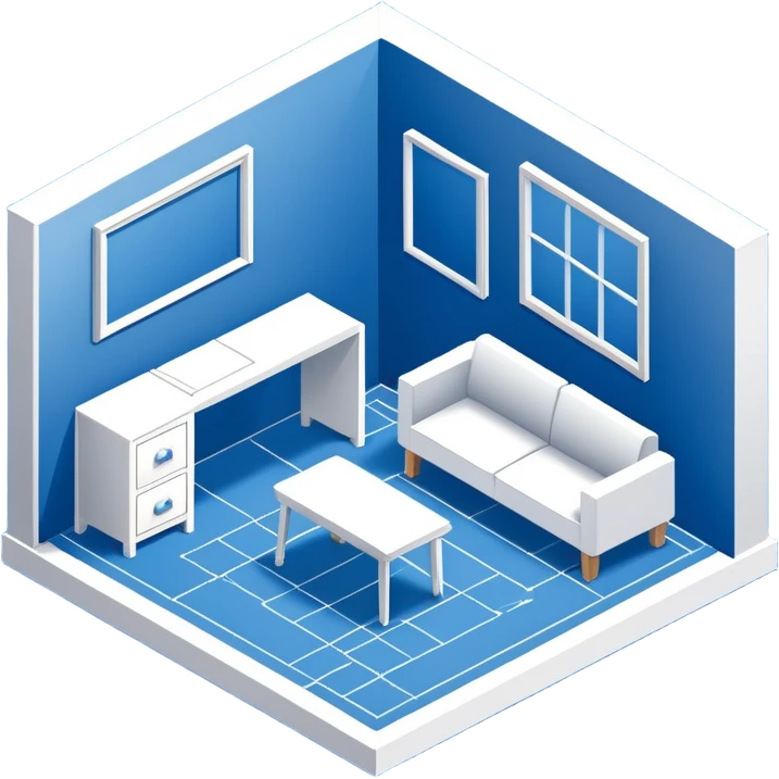 blue blueprint plan with white lines and shaded objects, isometric angle emoji