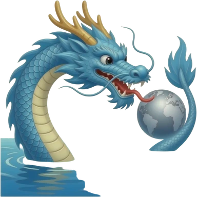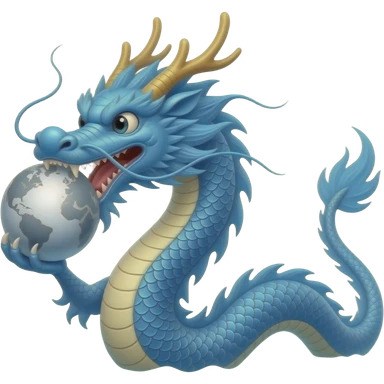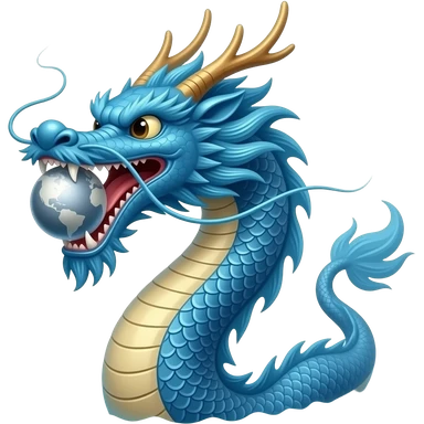 A blue Chinese serpentine dragon emerges from the sea and hovers above the surface, holding a silver planet in its teeth. emoji