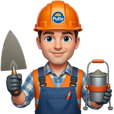 concrete mason with tools and Pulte on his hard hat emoji