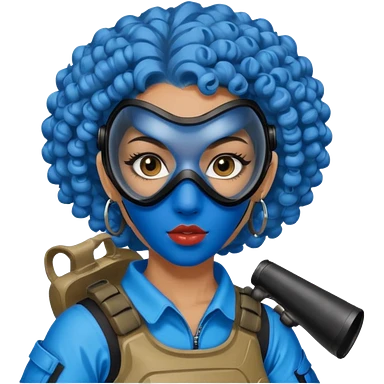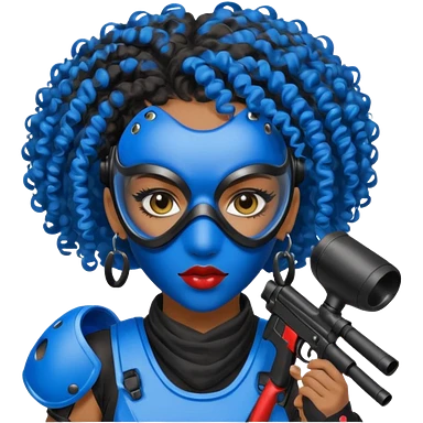 blue curly haired paintball player girl with huge earrings, wearing paintball mask emoji