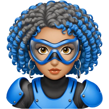 blue curly haired paintball playergirl with huge earrings, wearing paintball eye mask helmet emoji