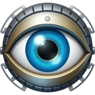 magical blue eye with a rotating mechanical iris, metallic rings and segments around the eye, intense vigilant look, slight glow, centered close-up, 3D glossy emoji style, clean background emoji