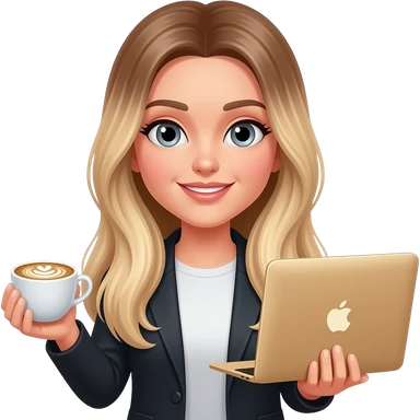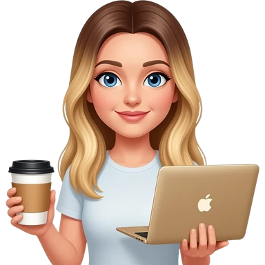 grey eye woman with very very long straight blond hair with light ombré with late art coffee and MacBook gold in other hands emoji