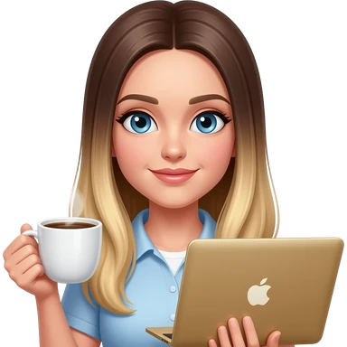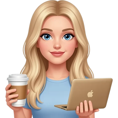 blue eye woman with long straight light ombré blond hair coffee and MacBook gold emoji